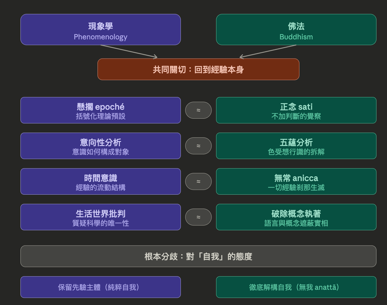 我意識到,現象學這種保持一點距離、刻意拉開停下來,回歸本體的感受,好像和佛學的概念類似。所以我的下個問題是:「現象學跟佛法之間,是不是有什麼關聯性?」