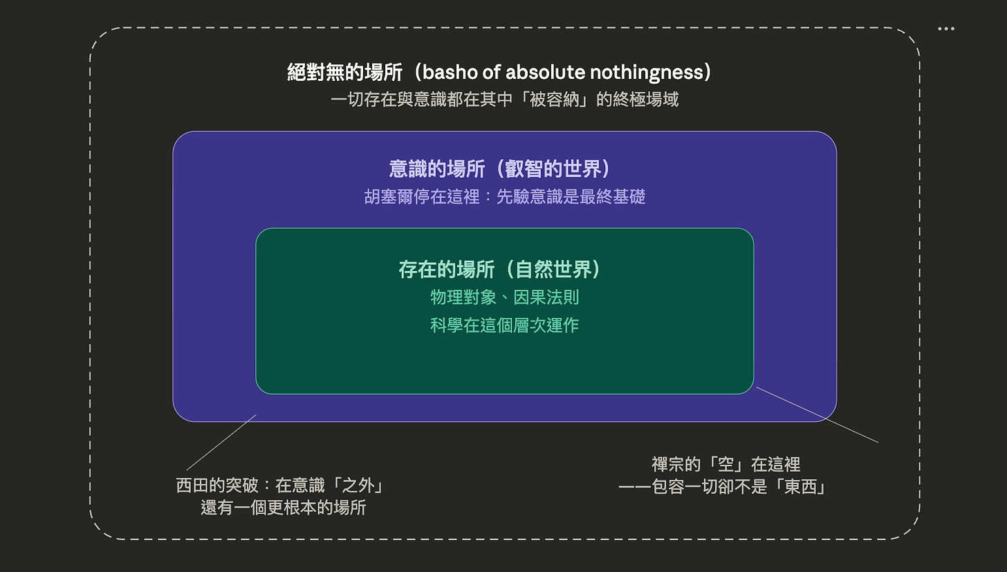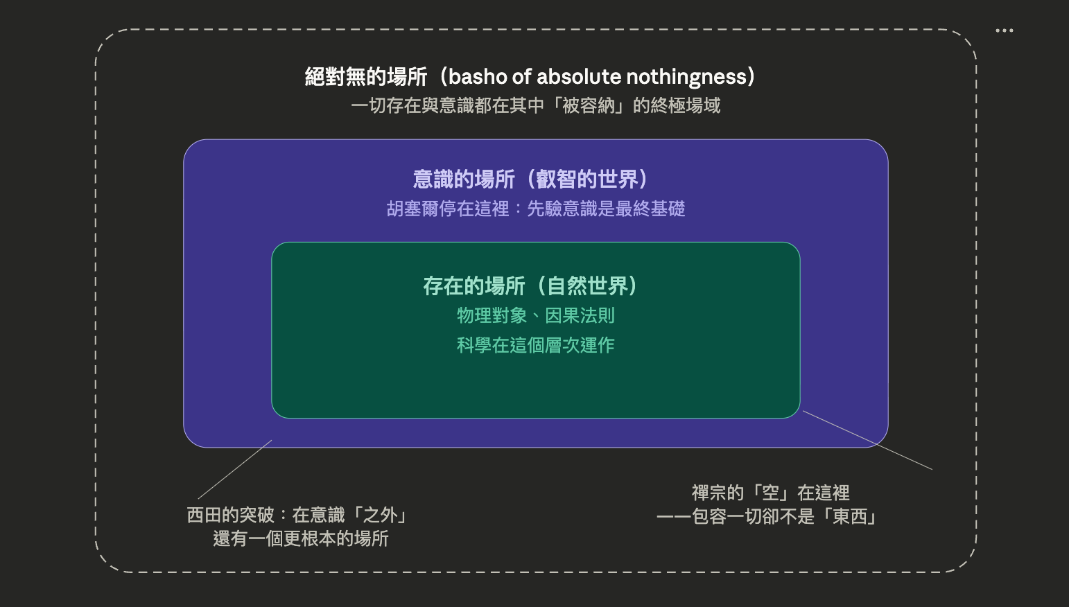 但有趣的是,日本京都學派,後來將佛教禪修與現象學的研究方法結合,因此創辦人西田幾多朗 (1870-1945),定義了一個概念是「絕對無的場所」(basho of absolute nothingness),一切存在與意識都在其中被容納,而這也最接近,佛教所謂的「空」。