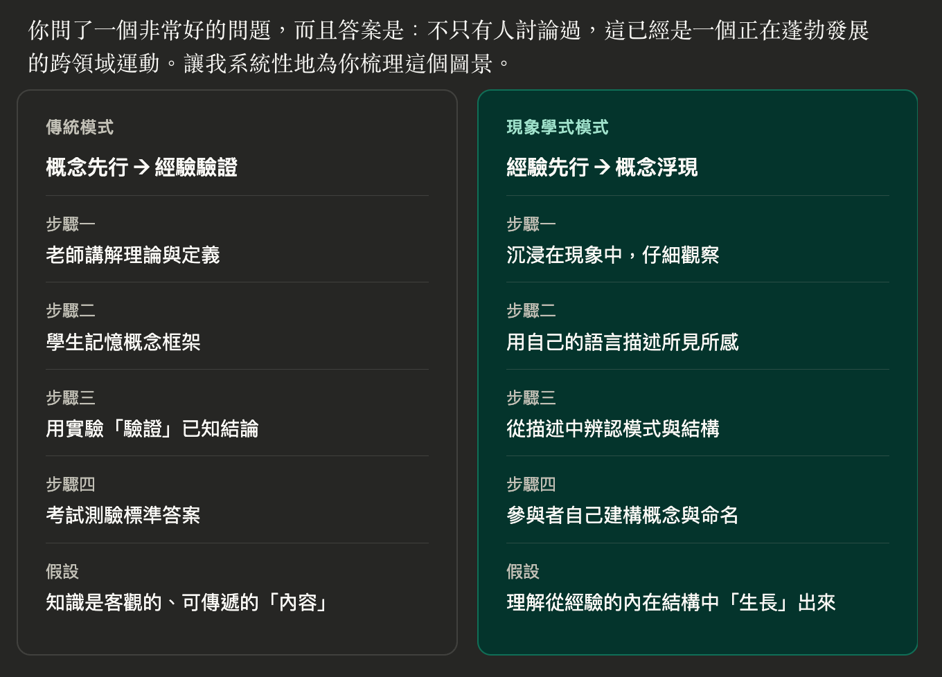 在和 Gemini 一來一往探索的時候,我抓到了一個字是「現象學」。