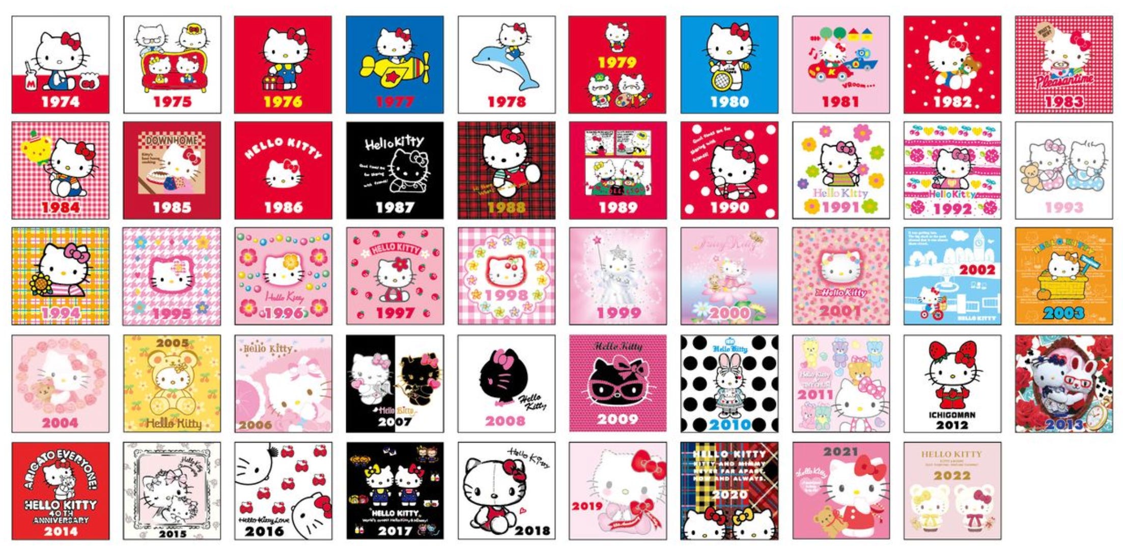 以 Hello Kitty 為例,已經走過了 50 週年,隨著年份變化,每個時期都有代表的設計。