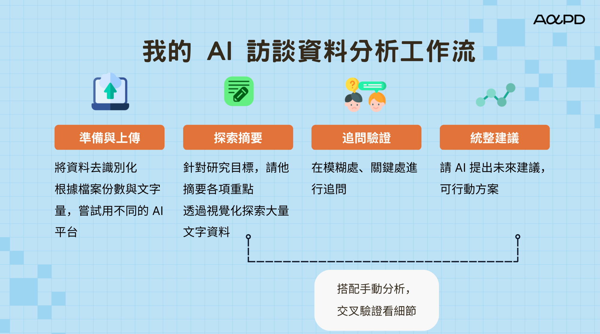 掌握AI 質性資料分析協作法:我會和大家分享這幾年淬鍊出來的 AI 資料分析協作方法,如何透過有邏輯的提問,一步步的讓 AI 統整出我們要的資料。